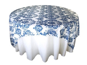 Matching and making the right choices for your tables, from the centerpiece to the table runners can be difficult. While you can easily choose the standard of matching patterns, a fresh color combination with complimentary shades is always more fun. With some great choices like the flocking taffeta table runners, you really want to make the table work as a whole. For this week’s color combination, we’re starting with a royal blue flocking taffeta table runner base and working our way through some complimentary color choices for the rest of your table decorations.