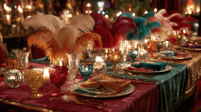 - Playful Centerpieces: Trade traditional florals for feather plumes, disco balls, or colorful ornaments.