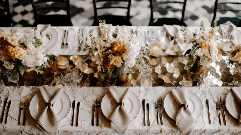 A metallic sequin runner adds definition without stealing the whole show. If you prefer something softer, velvet or foil organza runners bring texture and movement, which pairs beautifully with reflective surfaces. - Napkins