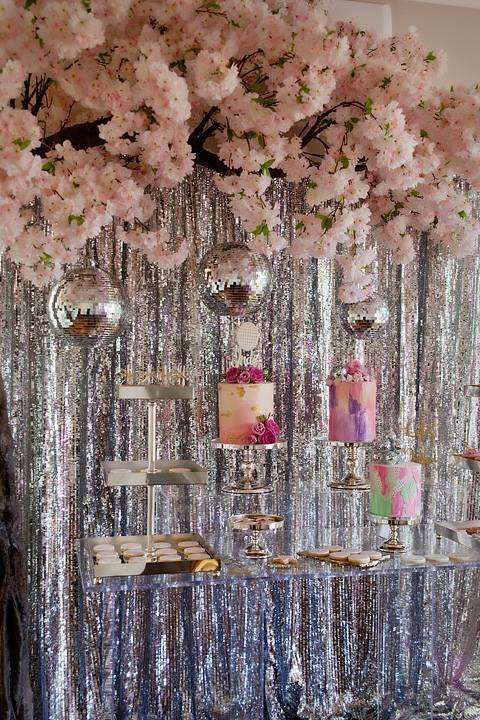 Like foil, sequin is the best friend of disco. To recreate that groovy vibe, you can use it everywhere, from your attire to the tabletop. For example, to make your desserts even more alluring, feel free to create this setup. To begin with, you’ll match our silver sequin curtain with a glass table. Once the curtain is installed, attach our silk cherry blossom bushes to the upper part of the backdrop. To make your desserts more prominent, you can place them on our gold and silver beaded cake stands. In the end, top everything off with a few mirror balls.