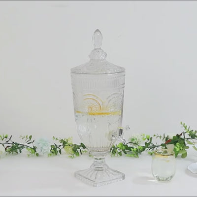 Bring a classic touch to your refreshment station with this vintage glass beverage dispenser. Measuring 19" tall and holding up to 3 liters, it features a vertical panel design accented with a floral medallion pattern that adds timeless style to any table. The clear cut glass construction beautifully showcases colorful punches, lemonades, or fruit-infused water, while the sturdy lid keeps beverages fresh. An easy-pour spigot ensures drip-free serving, making this decorative glass drink dispenser with lid both practical and eye-catching. Perfect for weddings, banquets, birthdays, or seasonal gatherings, it seamlessly combines functionality with a refined appearance.