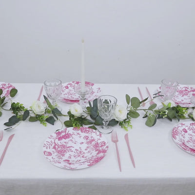 Set a romantic tone for your event with this 10-pack of pink and white floral plates in a classic French Toile design. Crafted from premium hard plastic, these 7-inch round plastic dessert plates offer both beauty and durability. Perfect for serving salads, appetizers, and desserts, they combine the charm of timeless design with the practicality of disposable convenience.